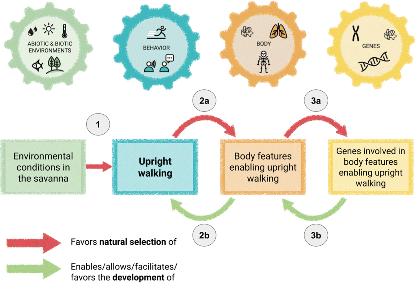 One way to solve this is to carefully label the causal arrows, differentiating between their levels of description. Take the following example, taken from a description of causal mapping in evolutionary biology education (Hanisch & Eirdosh, 2020). In this example, the authors distinguish between evolutionary and developmental processes as different forms of causality, while also clearly separating the genetic, organismic, behavioural and environmental levels.
